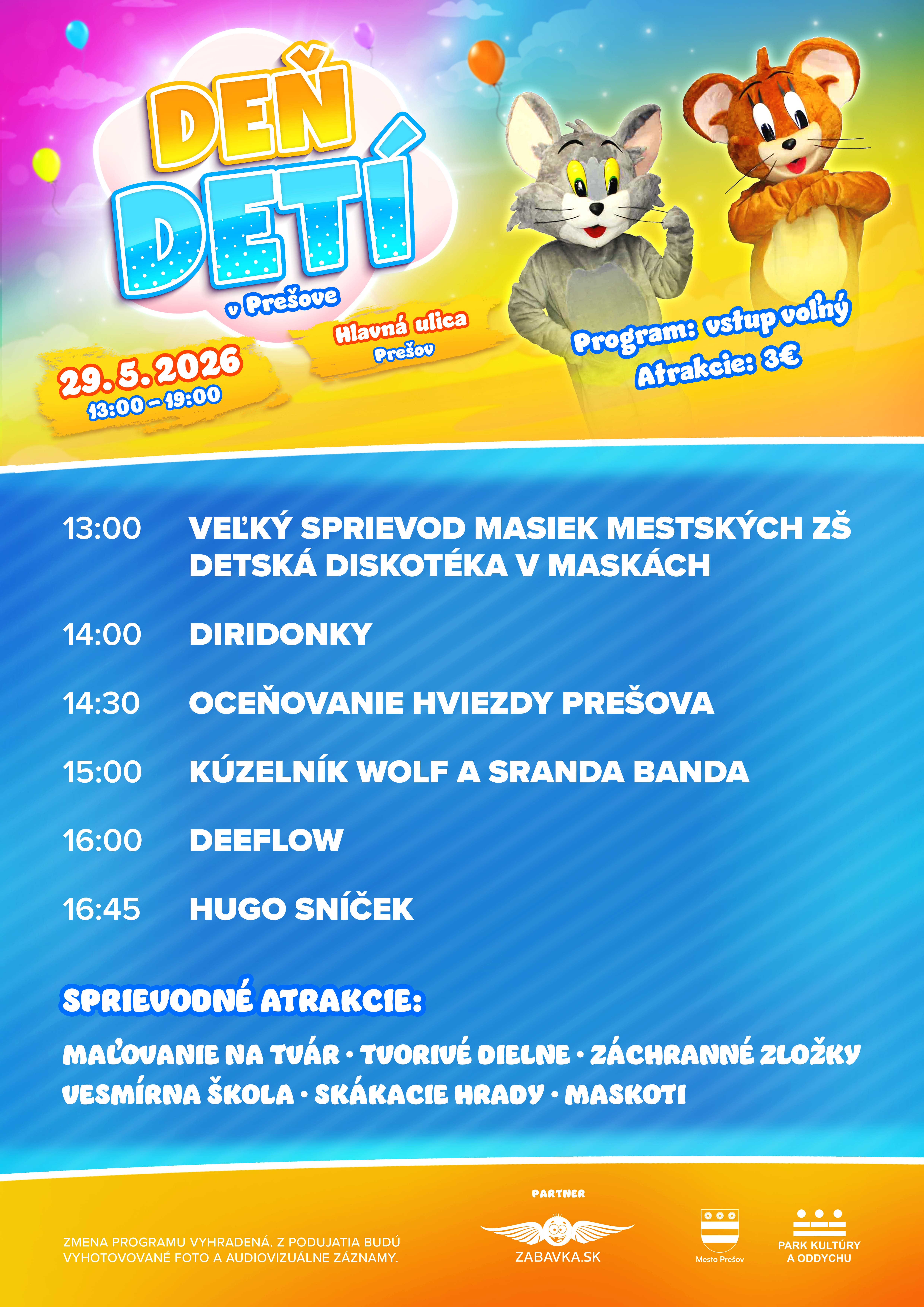 Park kultúry a oddychu v Prešove v spolupráci s mestom Prešov pozývajú všetky deti, rodičov aj starých rodičov na oslavu Medzinárodného dňa detí, ktorá sa uskutoční v piatok 29. mája 2026 na Hlavnej ulici v Prešove. Podujatie potrvá od 13:00 do 19:00 hod. a ponúkne pestrý program plný zábavy, hudby a sprievodných aktivít.